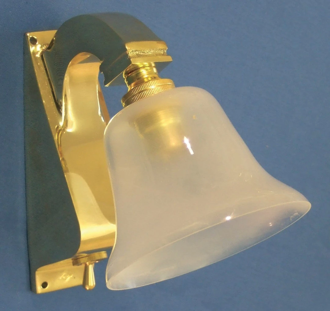 Polished cast brass light fixture supplied with a frosted bell glass, SBC (BA15d) bulb holder and toggle switch.